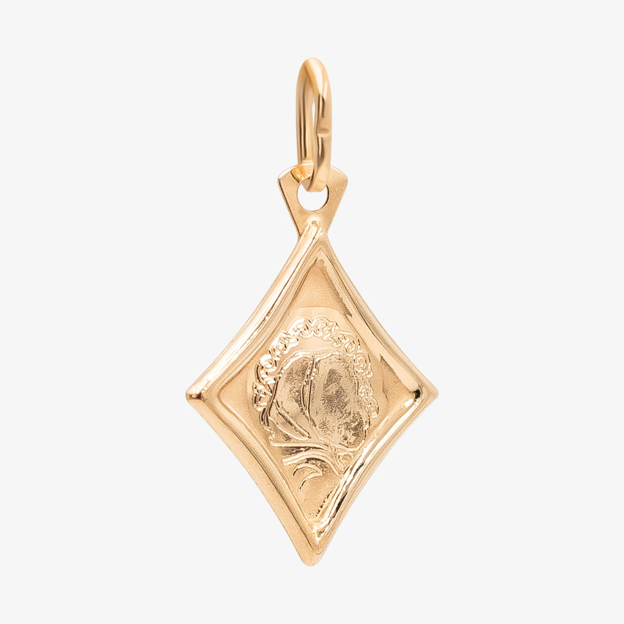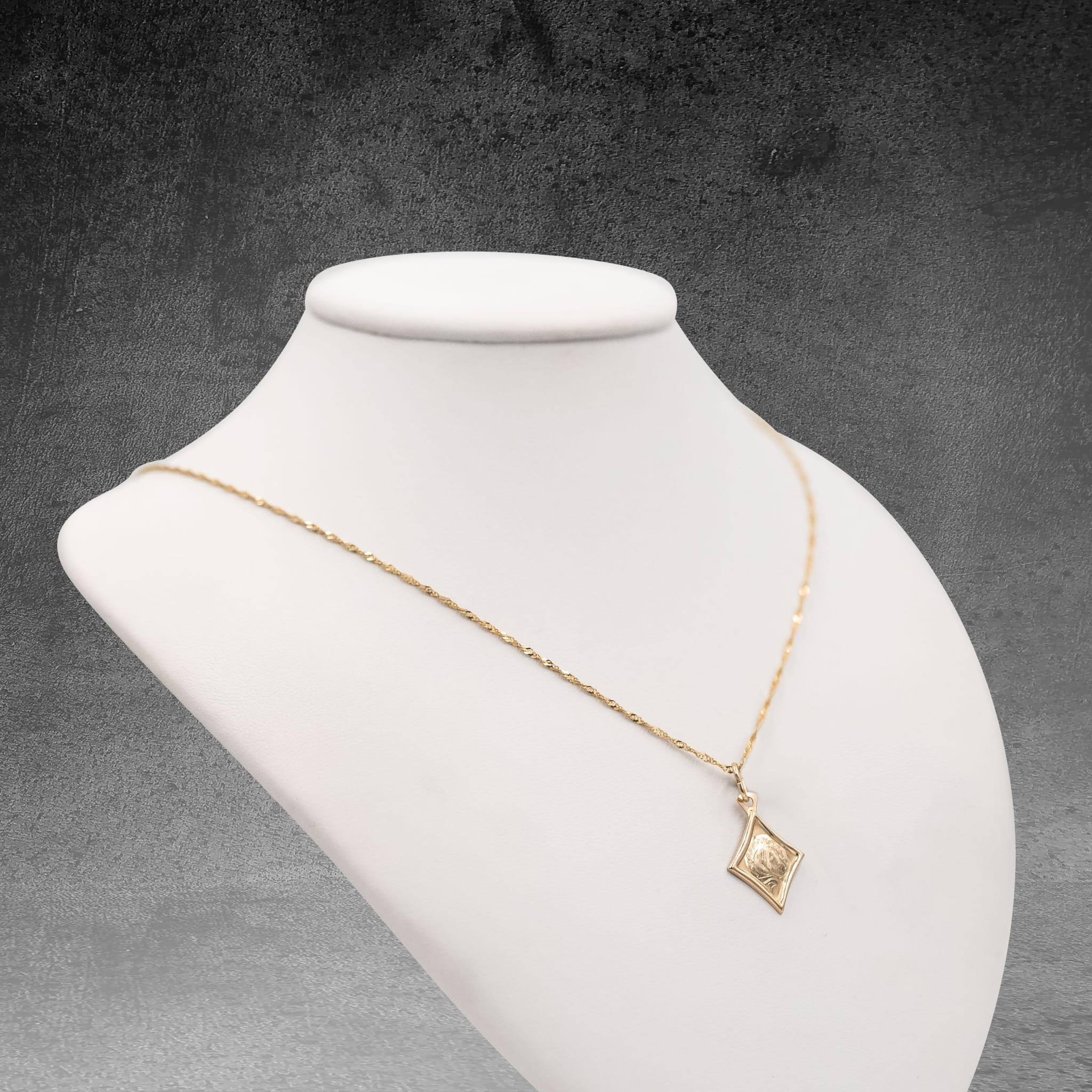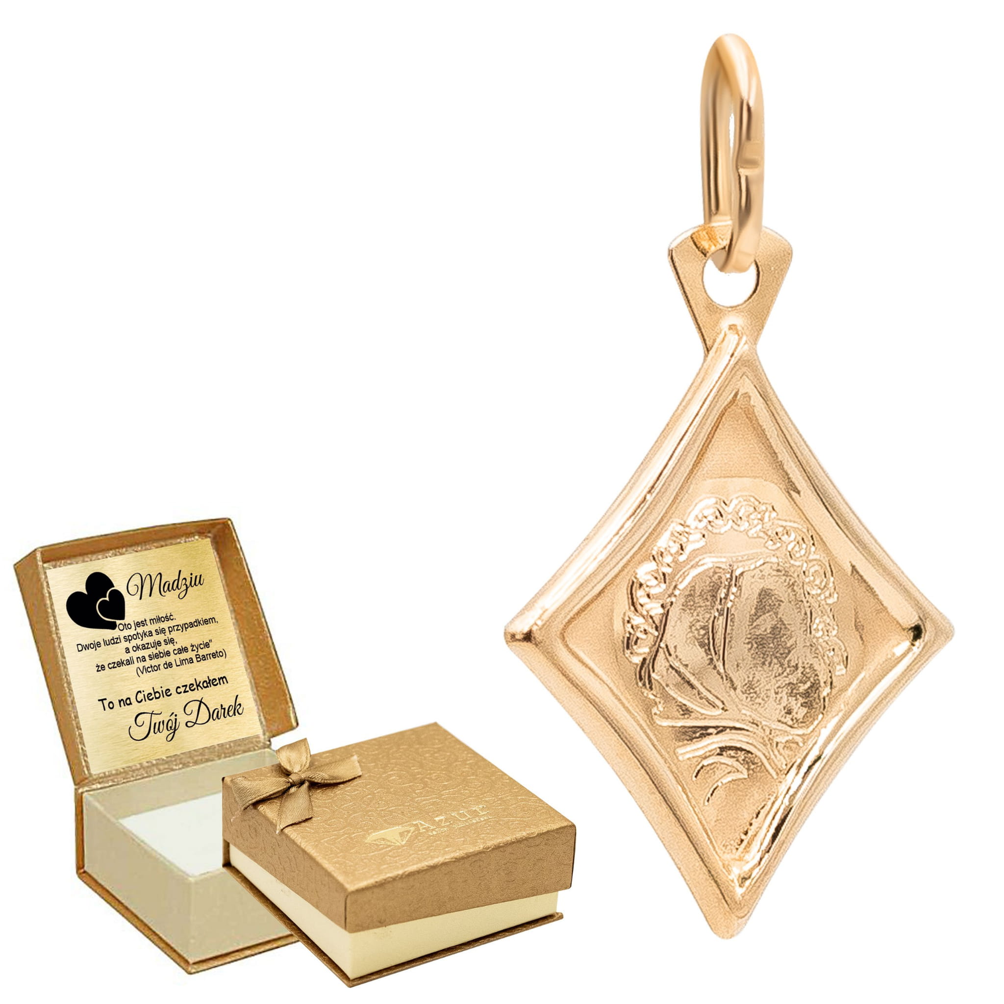 Złota w niestandardowym kształcie i delikatnie zdobiona zawieszka medalik z Matką Boską i Dzieciątkiem Jezus. Prezent podarowany z okazji Świąt, Bierzmowania oraz Komunii Świętej z pewnością wywoła wiele radości i szeroki uśmiech na twarzy.