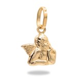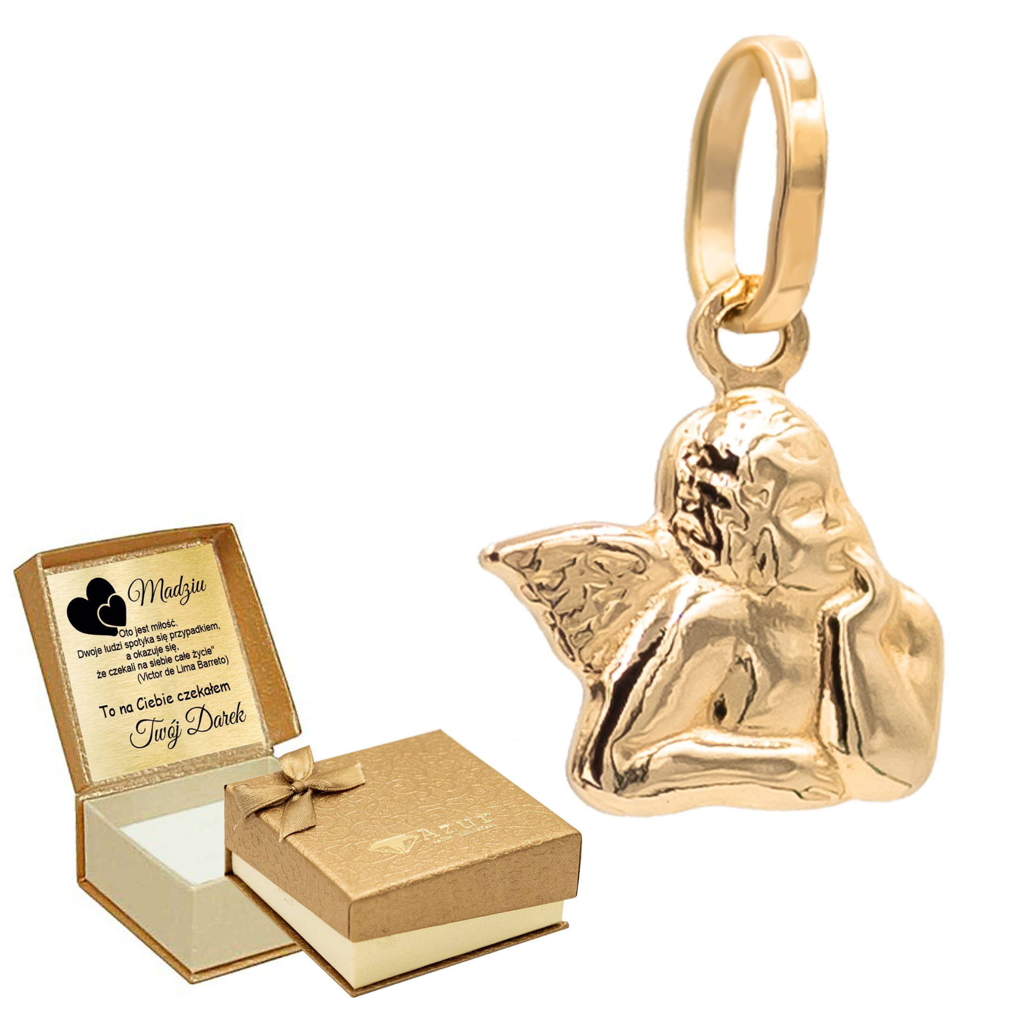 Złota zawieszka w kształcie aniołka. Jest to cudowny prezent, który możemy wręczyć z okazji Świąt, urodzin oraz Komunii Świętej. Wręczony upominek z pewnością wywoła wiele radości i szeroki uśmiech na twarzy.