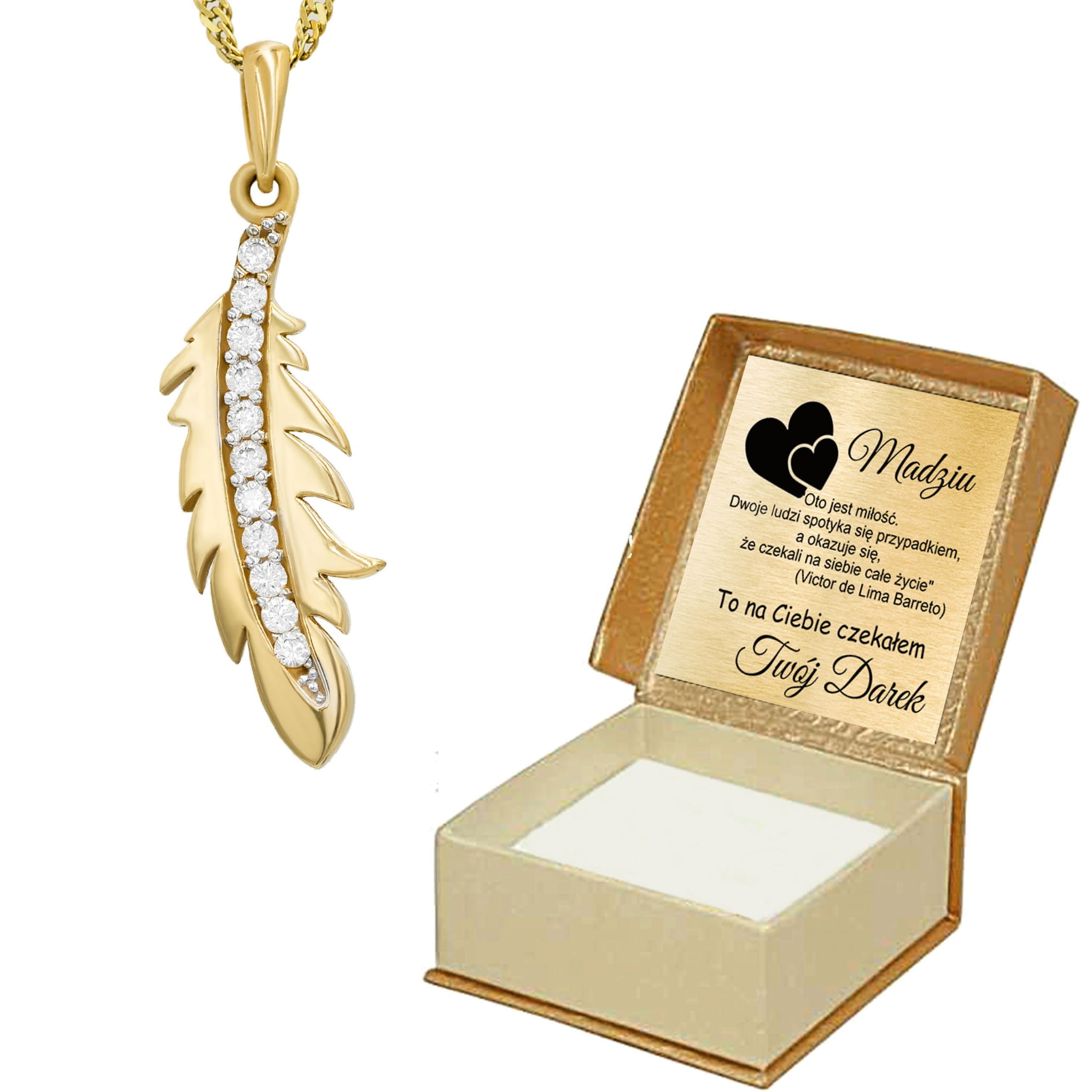 Złota zawieszka o oryginalnym kształcie z osadzonymi cyrkoniami. Cudowny prezent, który możemy wręczyć z okazji imienin, urodzin czy także rocznicy. Wręczony upominek na pewno spowoduje uśmiech na twarzy. Każdy wzór posiada metkę jubilerską. Opakowanie GRATIS.