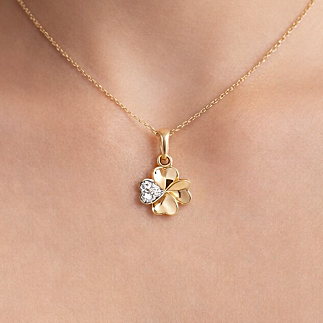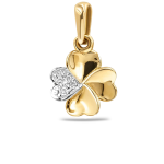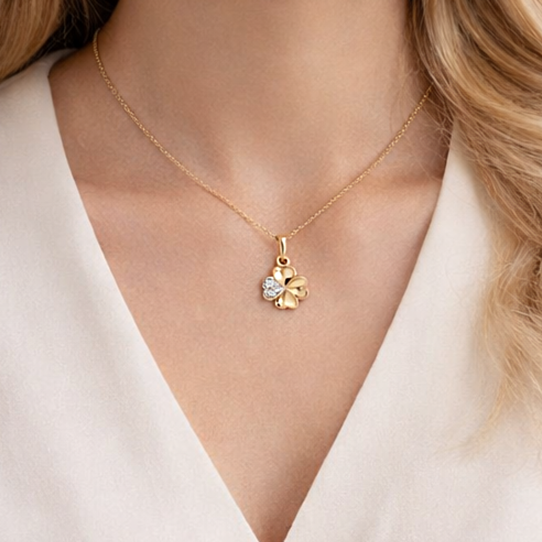 Złota zawieszka z koniczynką i osadzonymi cyrkoniami. Jest to cudowny prezent, który możemy wręczyć z okazji Świąt, urodzin oraz rocznicy. Wręczony upominek z pewnością wywoła wiele radości i szeroki uśmiech na twarzy.