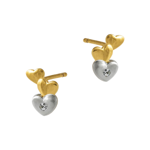 Kolczyki sztyfty Podwójne Serduszka to biżuteria, która łączy w sobie piękno i symbolikę. Wykonane z wysokiej jakości złota, ozdobione podwójnym sercem – jednym złotym, drugim w srebrzystym odcieniu, z subtelną cyrkonią, która dodaje blasku. Te kolczyki są idealnym symbolem miłości, który można nosić na co dzień lub na specjalne okazje.