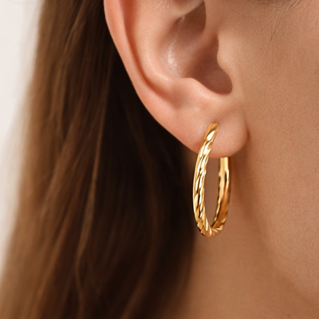 Złote kolczyki koła to ponadczasowa biżuteria, która dodaje stylizacji elegancji i lekkości. Skręcany, połyskujący wzór pięknie odbija światło, dzięki czemu kolczyki subtelnie podkreślają urodę i pasują zarówno na co dzień, jak i na wyjątkowe okazje.