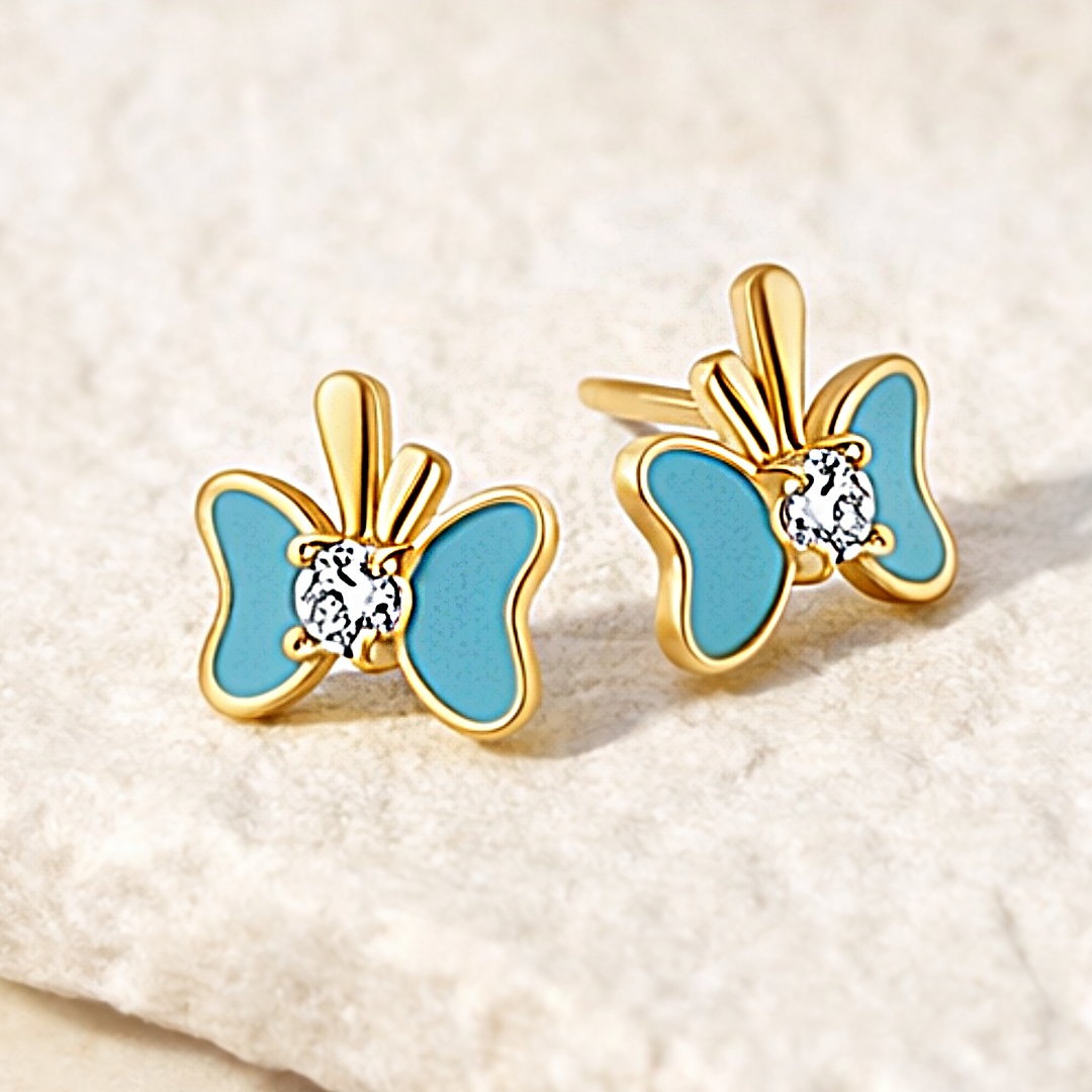 Motyw motyla symbolizuje radość, wolność i piękno, dlatego kolczyki świetnie sprawdzą się jako prezent na ważną okazję lub drobny upominek pełen uroku. Niebieska emalia w połączeniu z jasnym kamieniem tworzy efekt elegancki, a jednocześnie bardzo dziewczęcy i ponadczasowy.