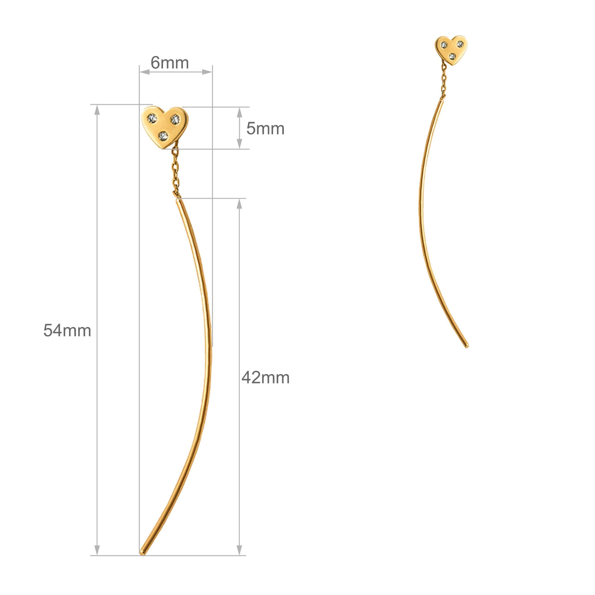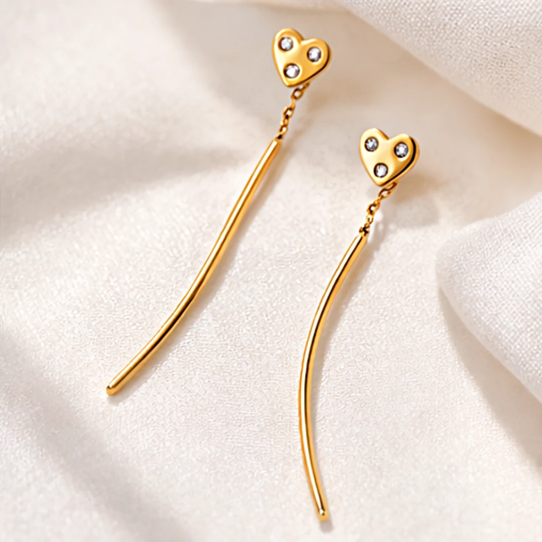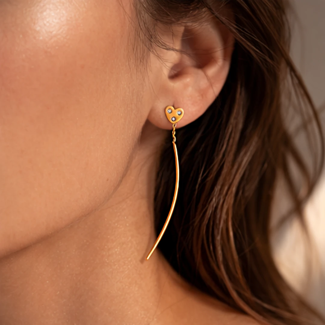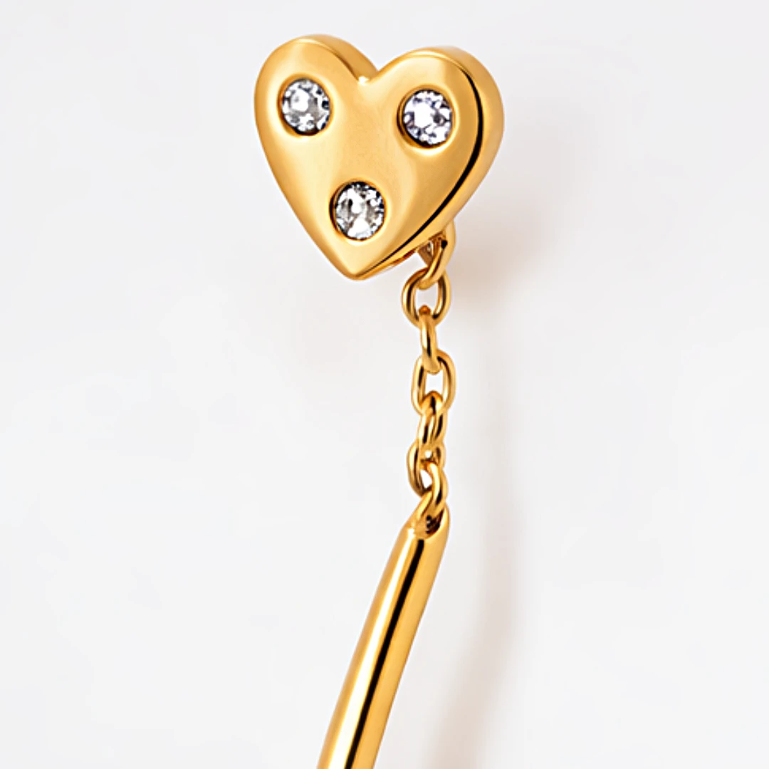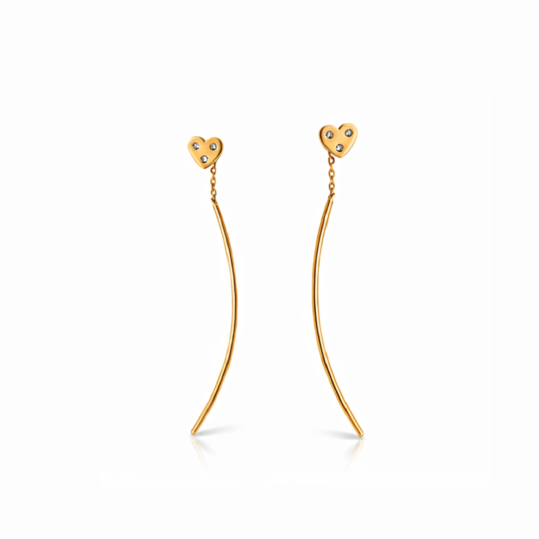 Te subtelne kolczyki przeciągane z motywem serca to biżuteria, która łączy lekkość formy z kobiecą elegancją. Ich smukły, wydłużony kształt pięknie prezentuje się na uchu, a błyszczące kamienie dodają całości romantycznego i stylowego charakteru.