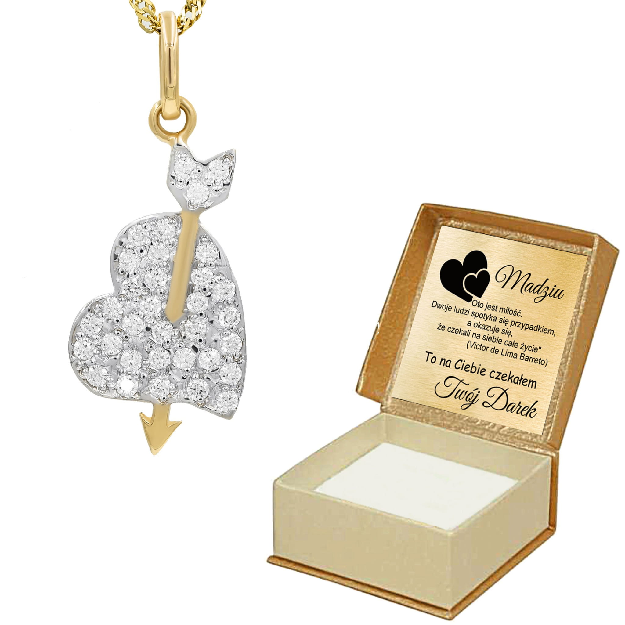 Złota zawieszka w kształcie serca z oryginalnym zdobieniem i osadzonymi cyrkoniami. Cudowny prezent, który możemy wręczyć z okazji imienin, urodzin, bierzmowania czy rocznicy. Wręczony upominek na pewno spowoduje uśmiech na twarzy. Każdy wzór posiada metkę jubilerską. Opakowanie GRATIS.
