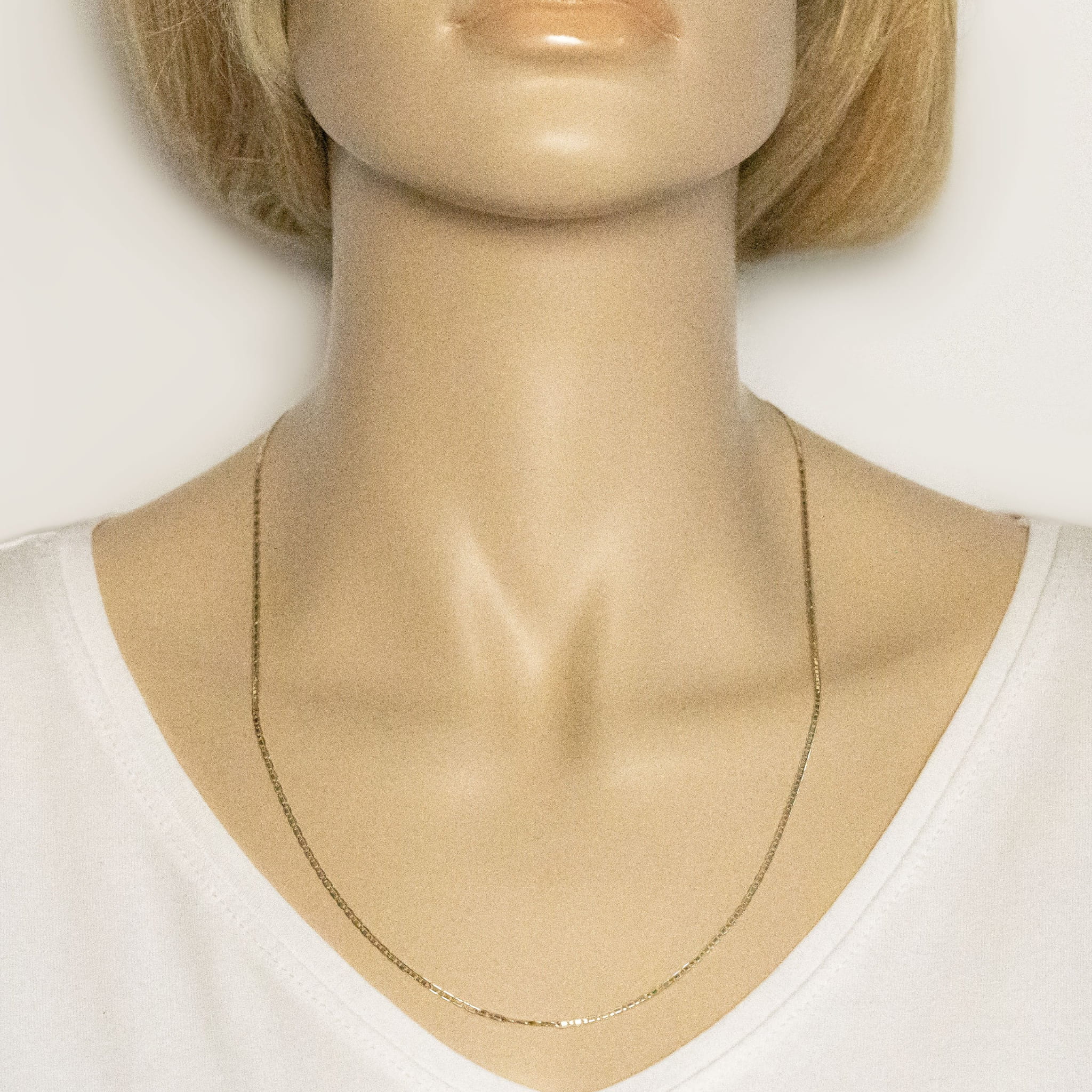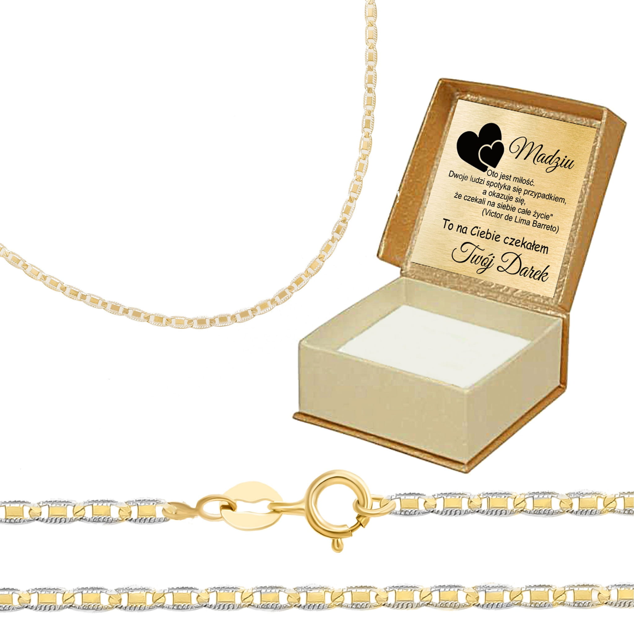 Złoty łańcuszek o diamentowanym i delikatnym splocie dla niej. Biżuteria o długości 55cm została wykonana z żółtego złota o najwyższej jakości próbie 0.585. Znakomicie będzie pasował do każdej stylizacji, której nada dodatkowego blasku. Podarowana kobiecie z okazji urodzin, Dnia Kobiet oraz wręczona bez okazji z pewnością wywoła u niej radość i szeroki uśmiech na twarzy.