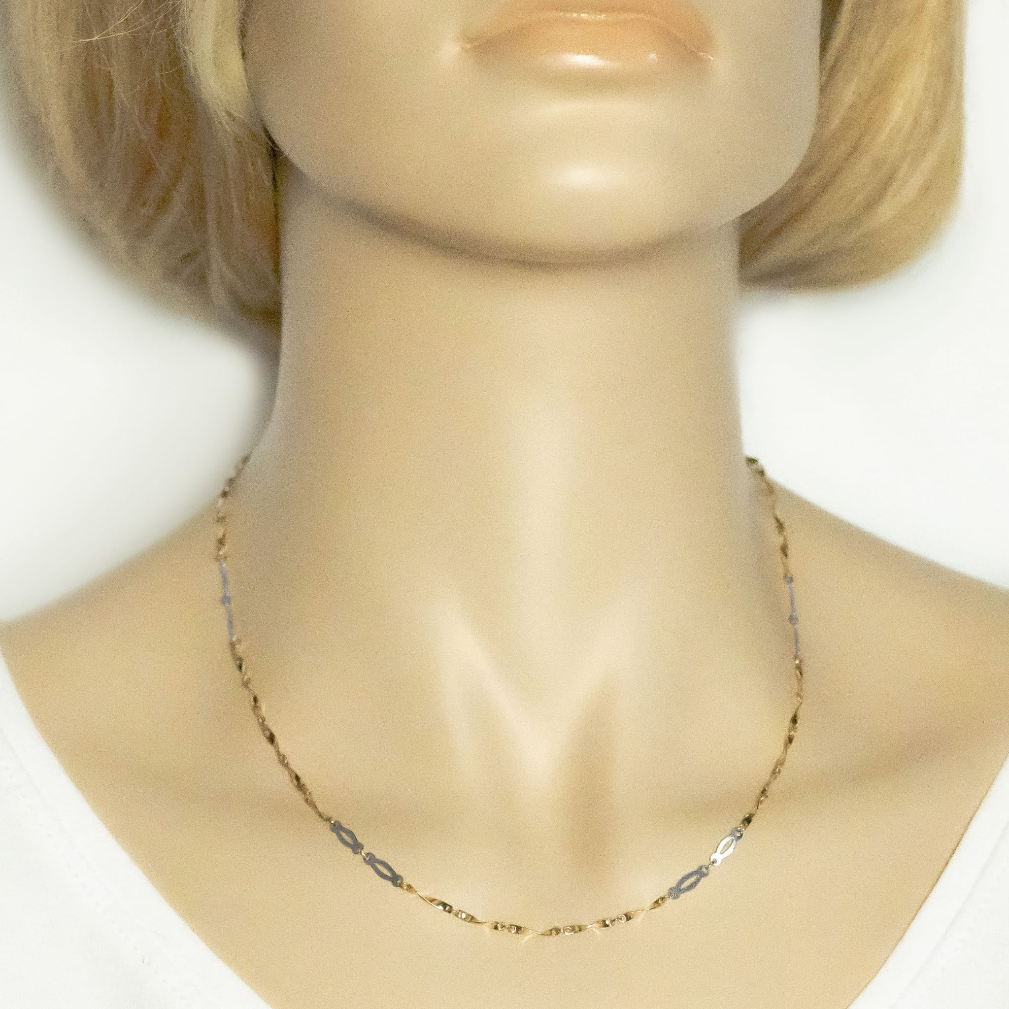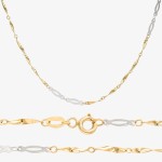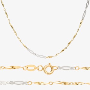 Złoty łańcuszek z barwionymi blaszkami. Biżuteria o długości 45cm została wykonana z żółtego i białego złota o najwyższej jakości próbie 0.585. Z pewnością nada blasku i elegancji Twojej wieczorowej stylizacji. Podarowana kobiecie z okazji urodzin, Dnia Kobiet oraz wręczona bez okazji z pewnością wywoła u niej radość i szeroki uśmiech na twarzy.