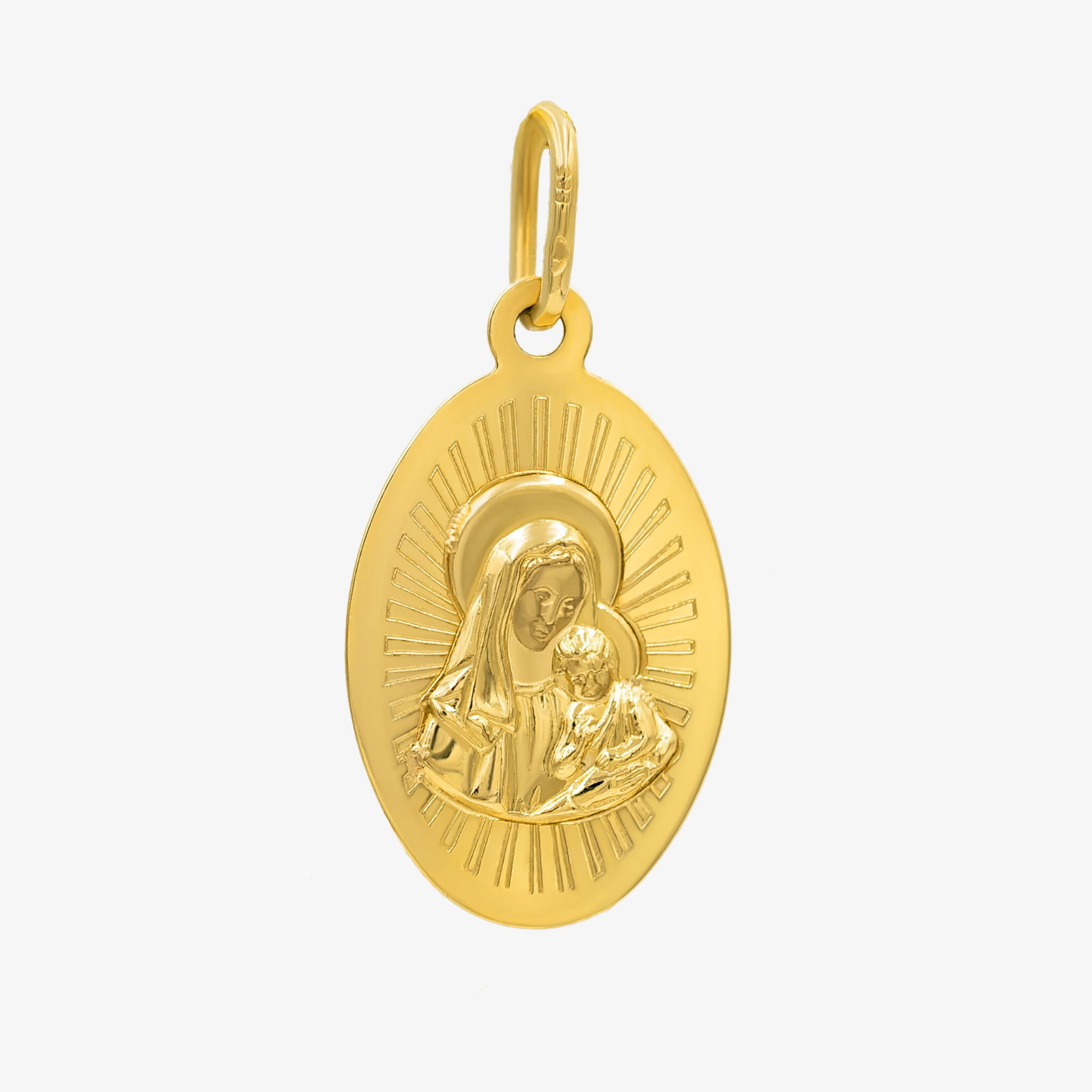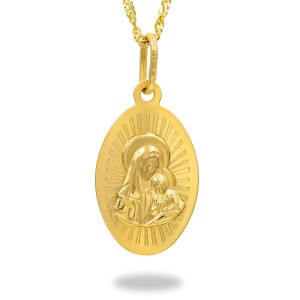 Złoty medalik o owalnym kształcie z Matką Bożą i Jezusem Chrystusem. Cudowny prezent, który możemy wręczyć z okazji Pierwszej Komunii Świętej, Bierzmowania lub Chrztu Świętego. Wręczony upominek na pewno spowoduje uśmiech na twarzy dziecka. Każdy wzór posiada metkę jubilerską. Opakowanie GRATIS.