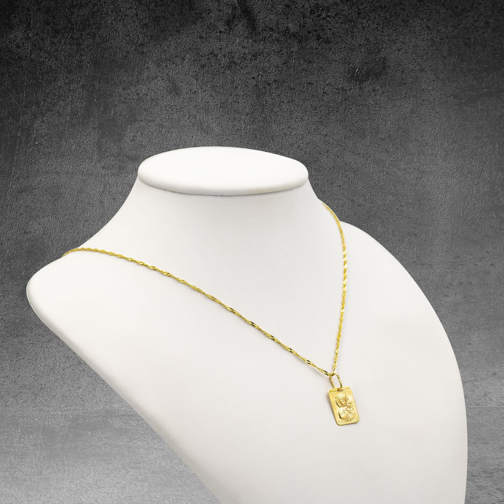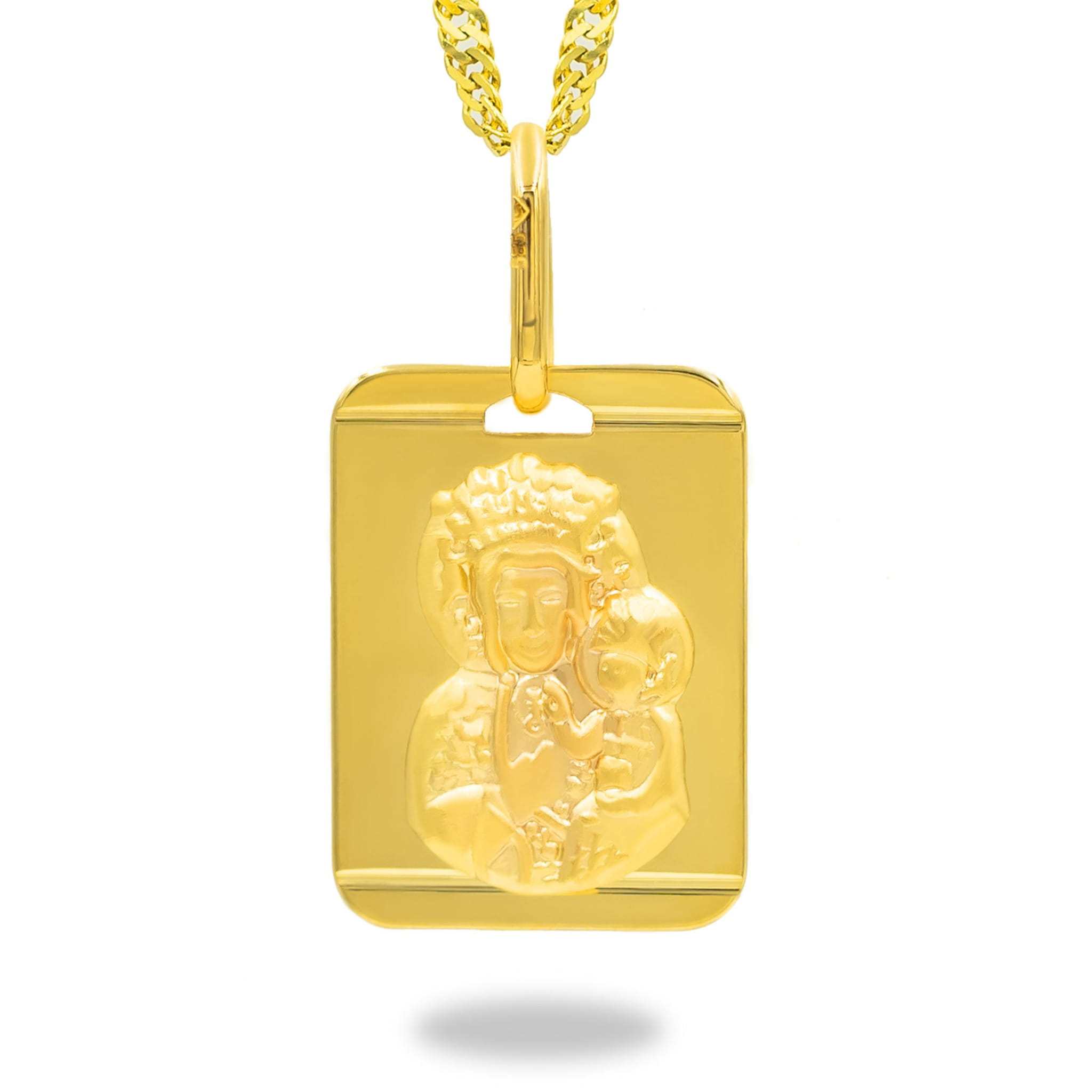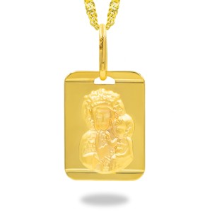 Złoty medalik prostokątny z wizerunkiem Matki Boskiej Częstochowskiej
