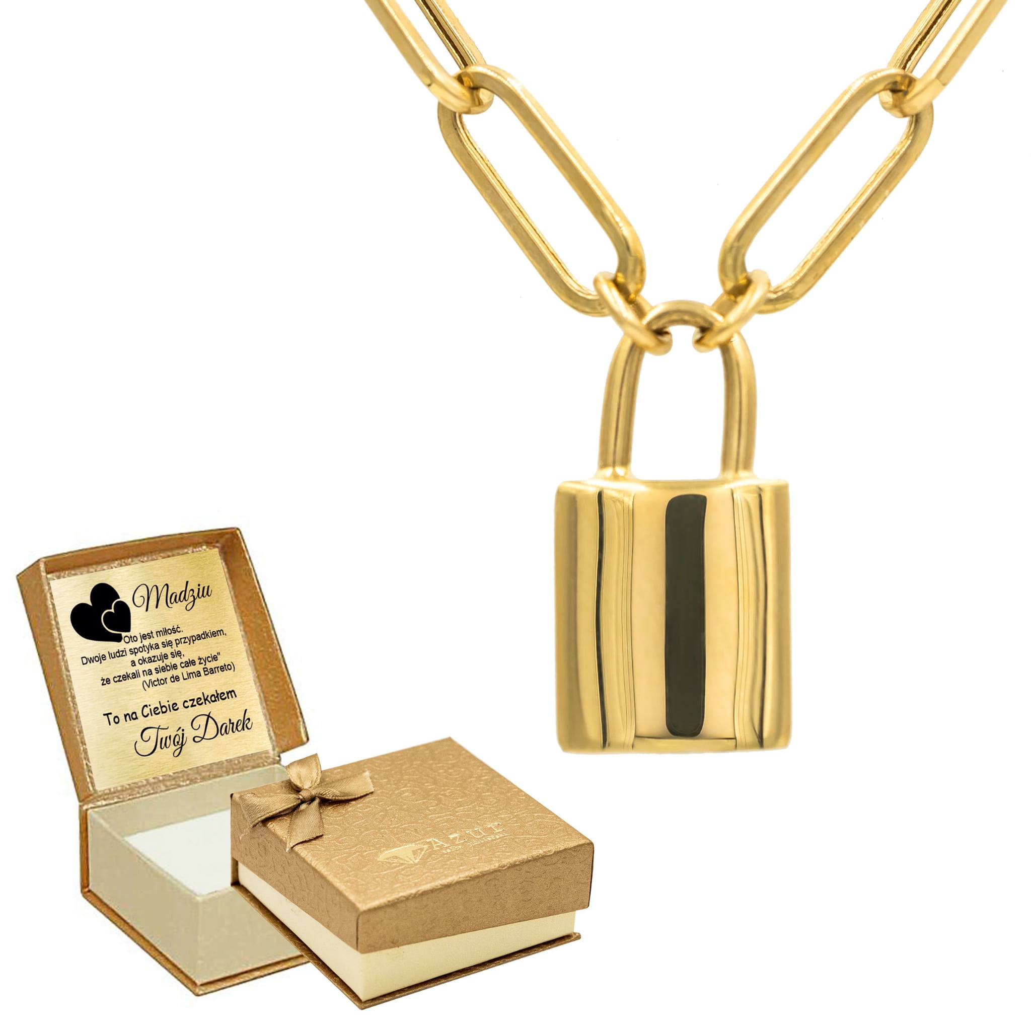 Złoty naszyjnik z kłódką to doskonały wybór dla osób szukających oryginalnych dodatków o głębszym znaczeniu. Idealny na prezent lub jako wyjątkowy dodatek do własnej kolekcji.