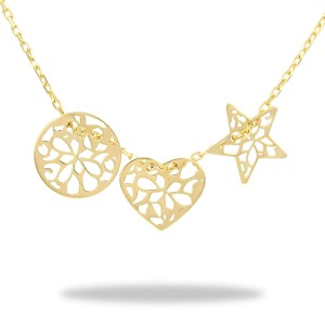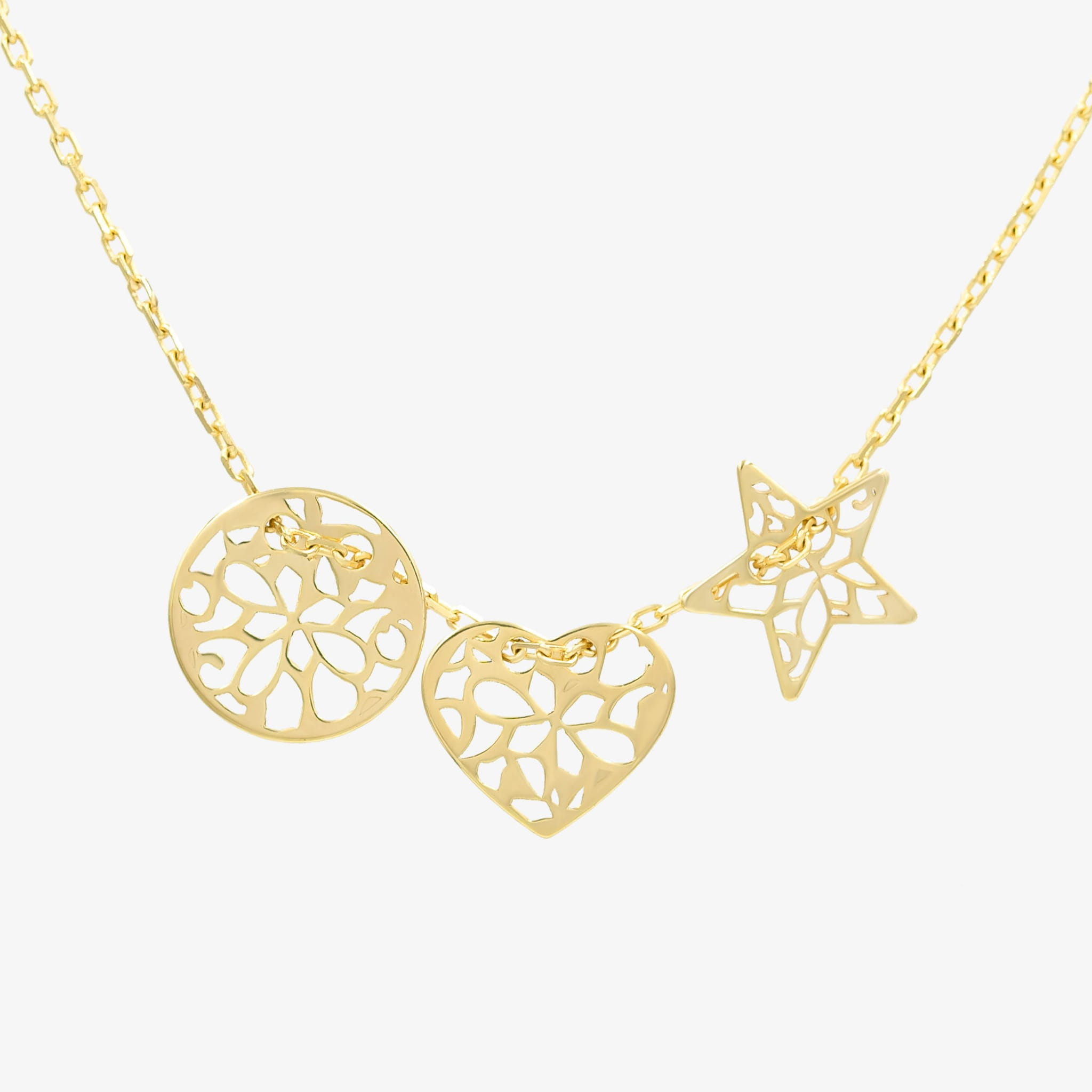 Podaruj sobie lub bliskiej osobie złoty naszyjnik z sercem, gwiazdą i okręgiem i pozwól, aby stał się symbolem pięknych chwil i wyjątkowych emocji.