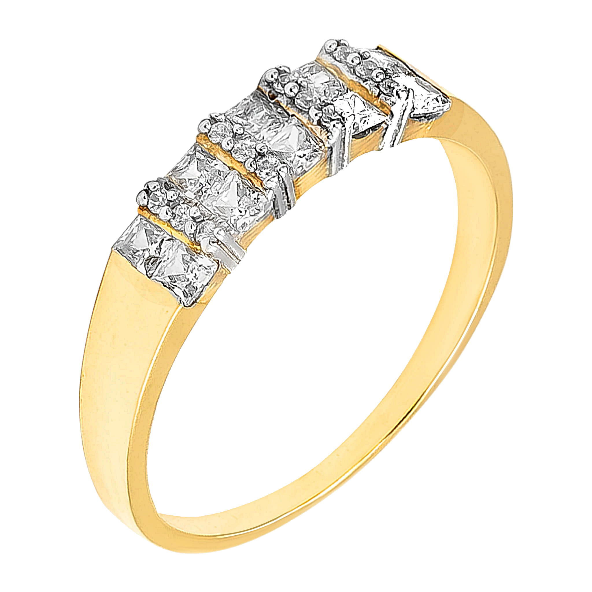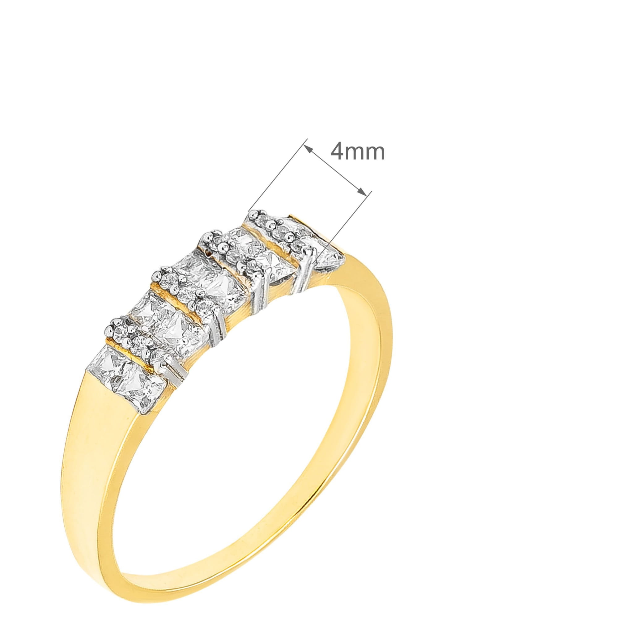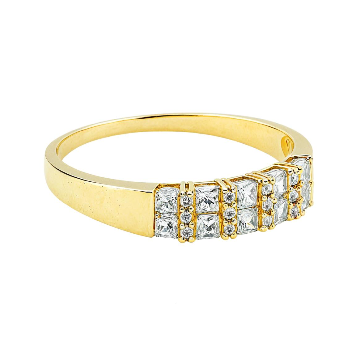 Cyrkonie o kwadratowym szlifie typu princess zostały osadzone w równej linii, dzięki czemu pierścionek prezentuje się nowocześnie i wyjątkowo estetycznie. Każdy kamień jest stabilnie utrzymany w klasycznej oprawie, co podkreśla ich blask oraz zapewnia komfort codziennego noszenia.