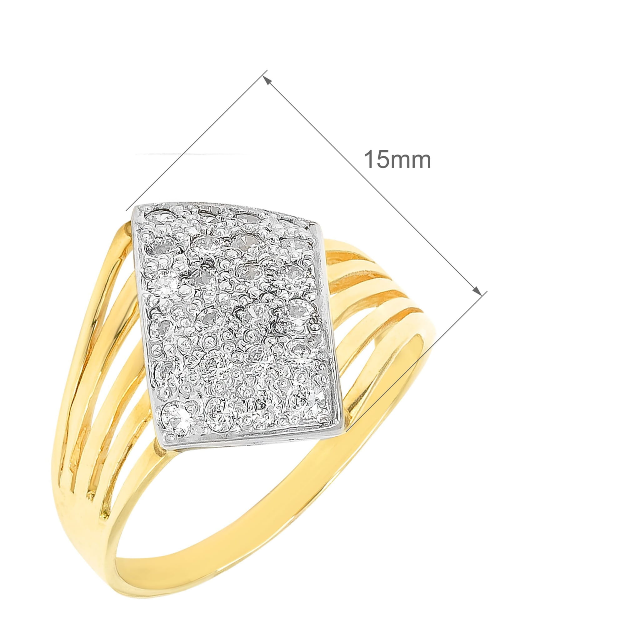Geometryczna oprawa nadaje pierścionkowi nowoczesny styl, a liczne cyrkonie pięknie odbijają światło, podkreślając luksusowy charakter biżuterii. Smukła obrączka oraz subtelne rozcięcia po bokach dodają całości lekkości i sprawiają, że pierścionek doskonale układa się na palcu.