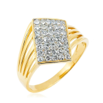 Wyrazista, prostokątna forma w połączeniu z intensywnym blaskiem cyrkonii tworzy biżuterię o nowoczesnym i zdecydowanym charakterze. Złoty pierścionek z cyrkoniami przyciąga uwagę precyzyjnym wykończeniem oraz efektowną kompozycją kamieni, które tworzą jednolitą, lśniącą powierzchnię.