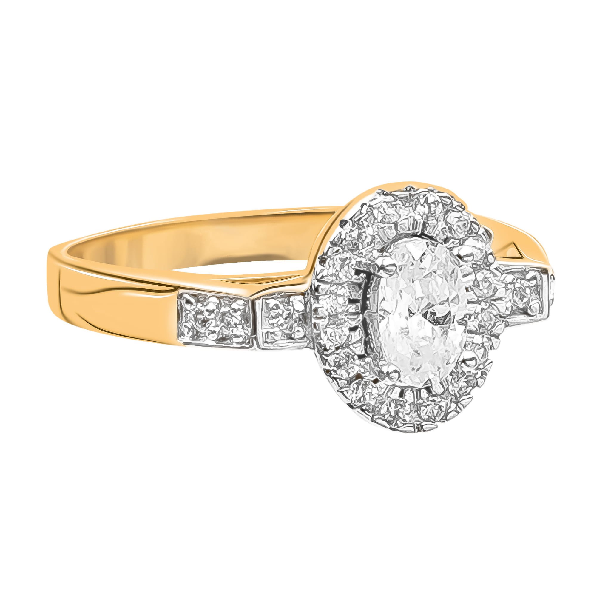 Złoty pierścionek z białymi, błyszczącymi cyrkoniami o różnej wielkości.