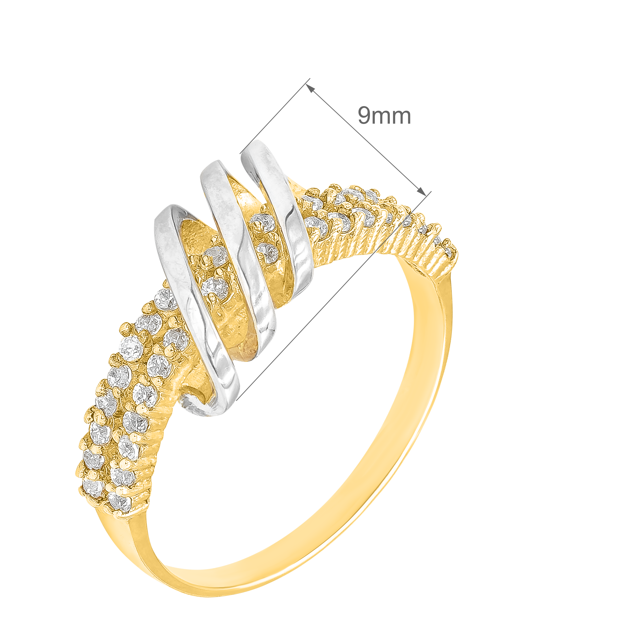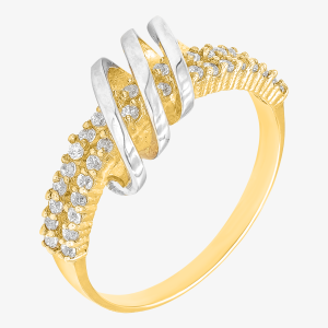Złoty pierścionek z oryginalnym przeplatanym wzorem oraz osadzonymi białymi cyrkoniami.