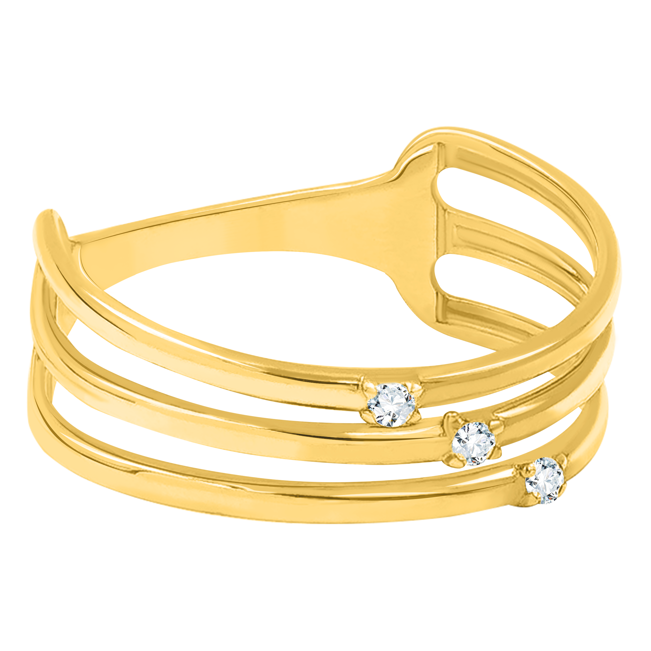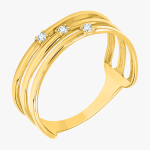 Złoty pierścionek potrójny z osadzonymi białymi błyszczącymi cyrkoniami.