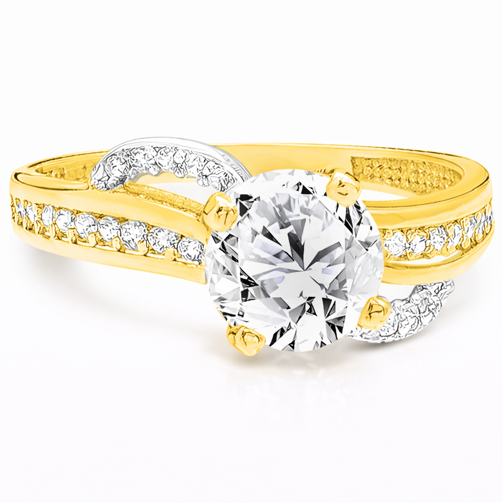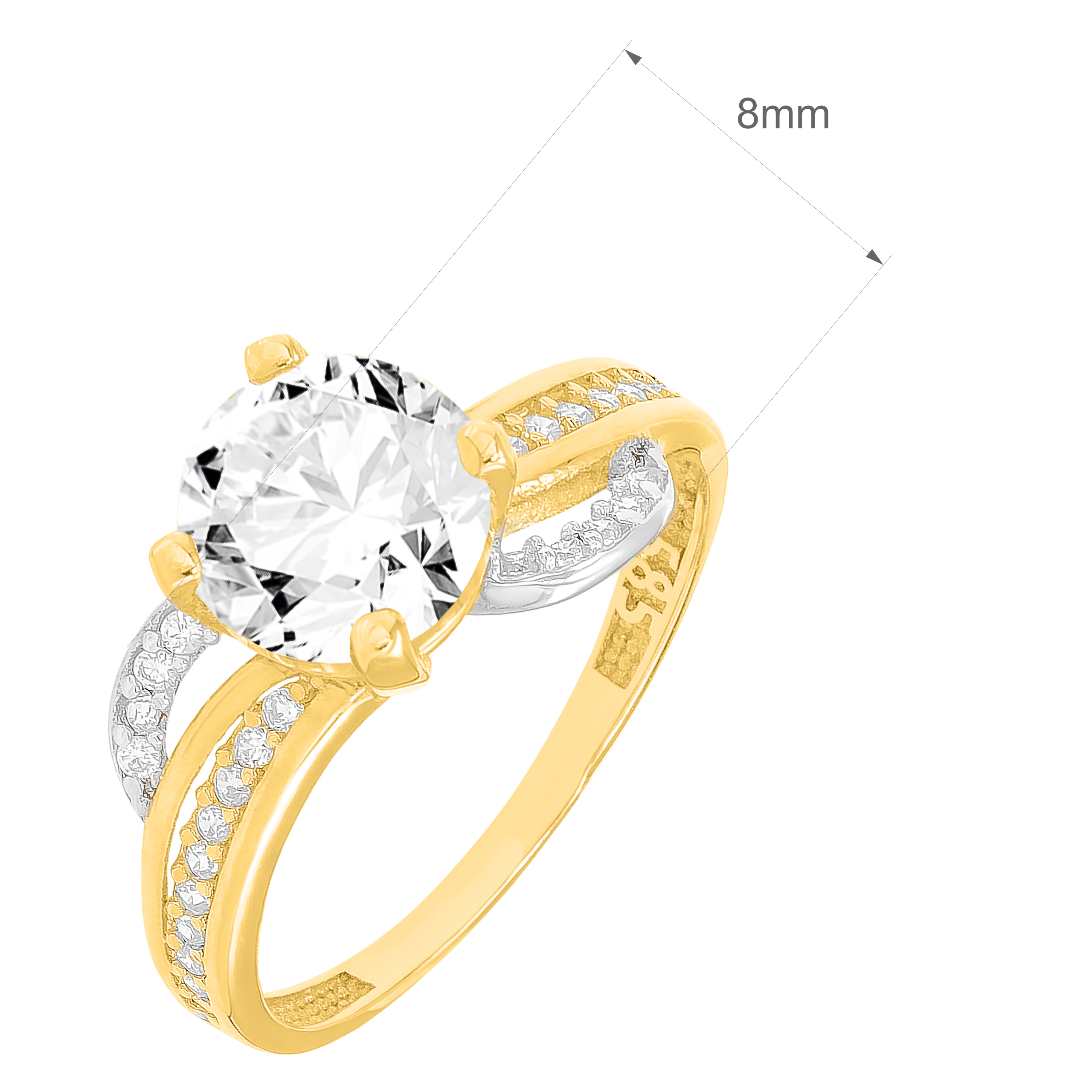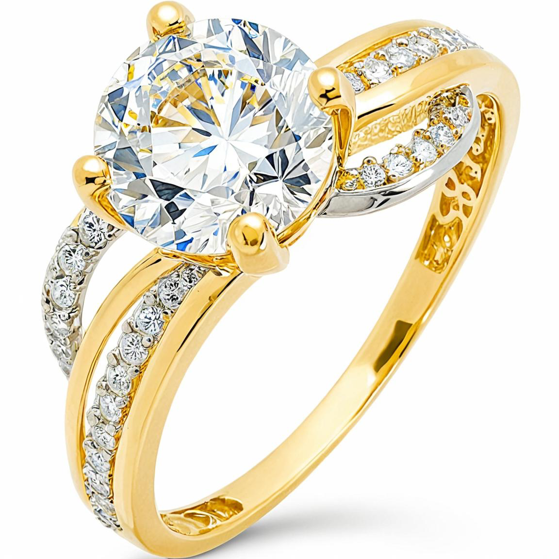 Złoty pierścionek z dużą cyrkonią i zdobioną obrączką