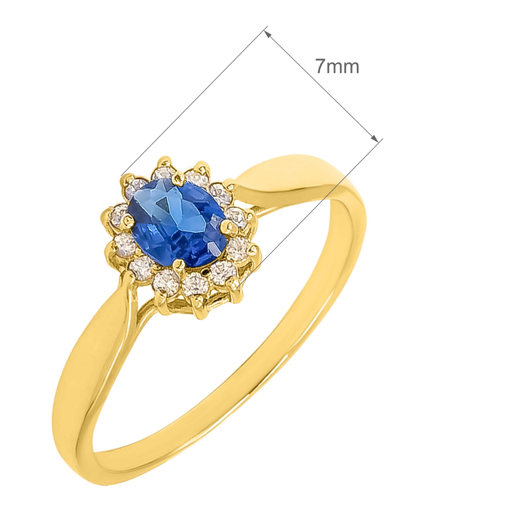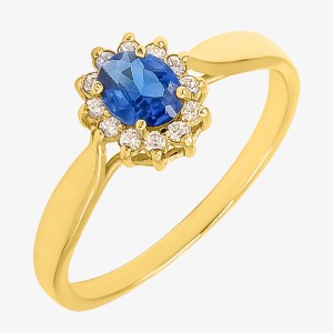 Złoty pierścionek z osadzoną w kolorze szafirowym i kilkoma białymi, błyszczącymi cyrkoniami.