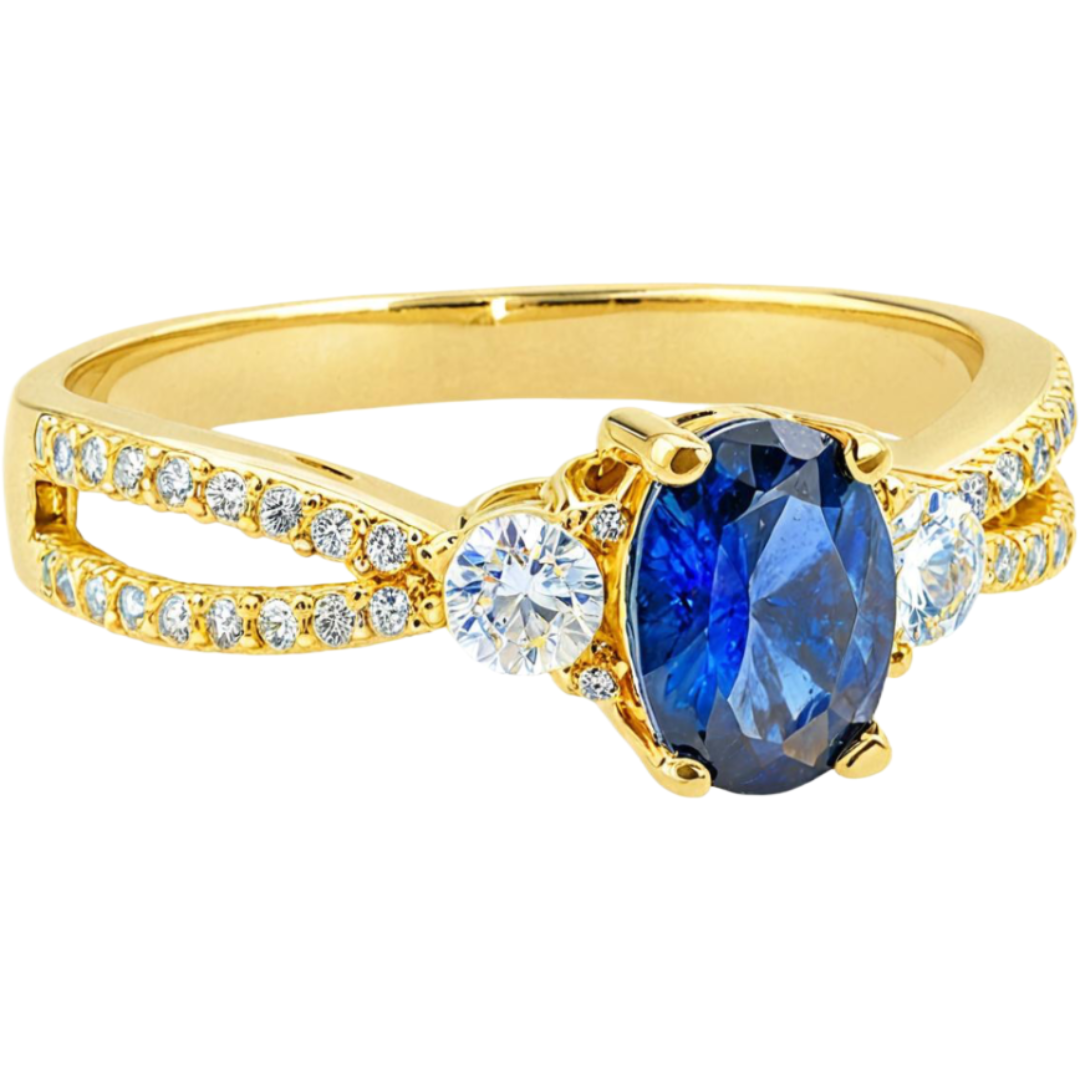 Złoty pierścionek o wyrazistej, eleganckiej formie, zaprojektowany z myślą o osobach, które szukają biżuterii przyciągającej uwagę. Centralny niebieski kamień w zestawieniu z jasnymi cyrkoniami tworzy kontrastowy i efektowny wygląd. To pierścionek złoty, który łączy klasyczną bazę z bardziej dekoracyjnym charakterem.