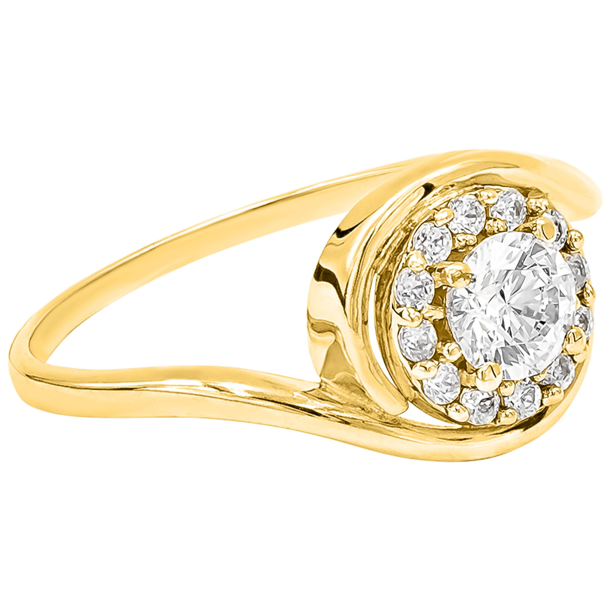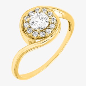 Złoty pierścionek z oryginalnym okrągłym wzorem i z osadzonymi białymi błyszczącymi cyrkoniami.