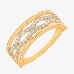 Złoty pierścionek z oryginalnym wzorem pokrytym dużą ilością błyszczących cyrkonii.
