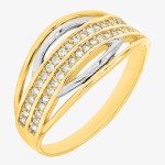 Złoty pierścionek o oryginalnym wzorze z wieloma osadzonymi białymi i błyszczącymi cyrkoniami.