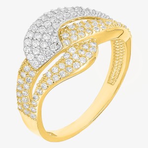 Złoty pierścionek o oryginalnym przeplatanym wzorze i z wieloma osadzonymi białymi cyrkoniami.