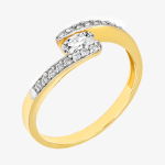 Złoty pierścionek z osadzonymi białymi i błyszczącymi cyrkoniami.