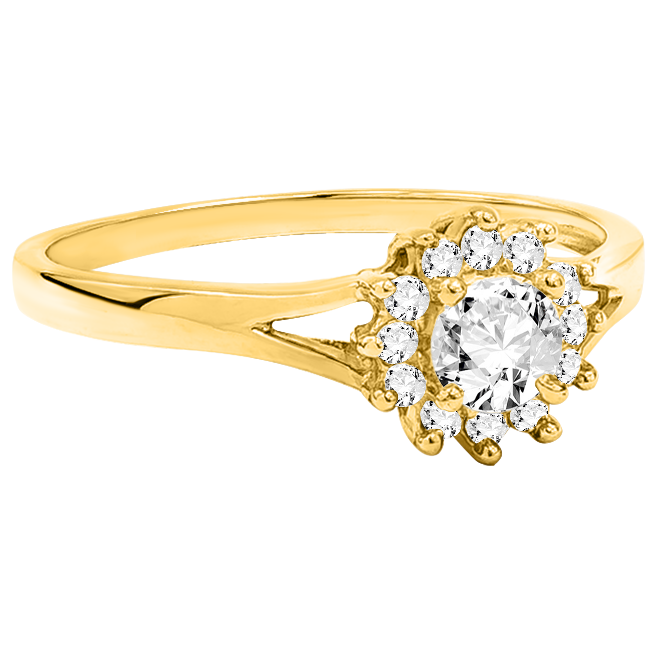 Złoty pierścionek z delikatnym zdobieniem i osadzonymi białymi błyszczącymi cyrkoniami.