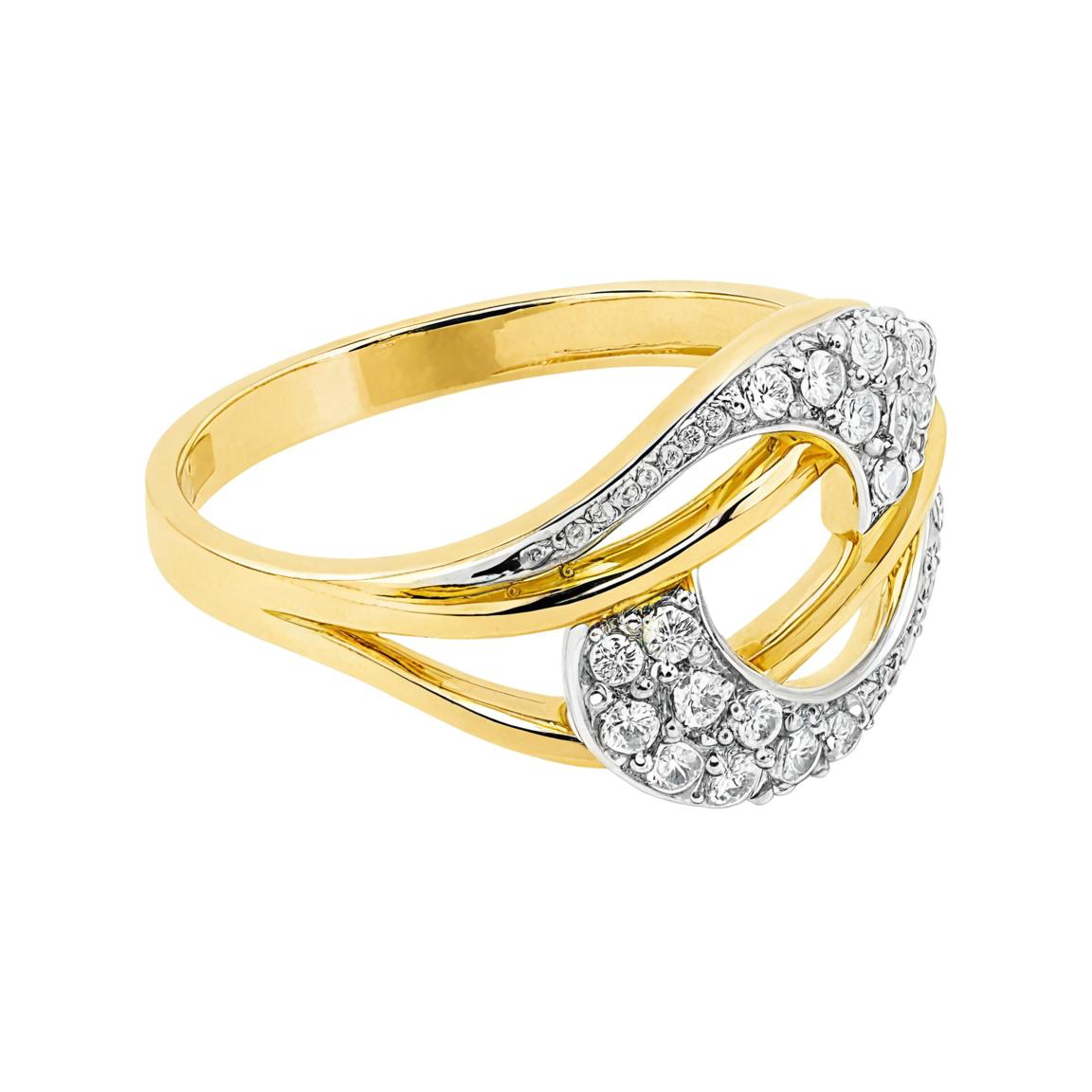 Na dłoni widać eleganckie „splatanie” dwóch linii: gładkiego złota oraz elementów z cyrkoniami, które łapią światło przy każdym ruchu. Taki dwukolorowy pierścionek dobrze pasuje do prostych stylizacji (koszula, sweter, marynarka), bo jeden detal buduje cały efekt. Jeśli szukasz modelu, który wygląda dopracowanie z każdej strony, to bardzo praktyczny wybór.