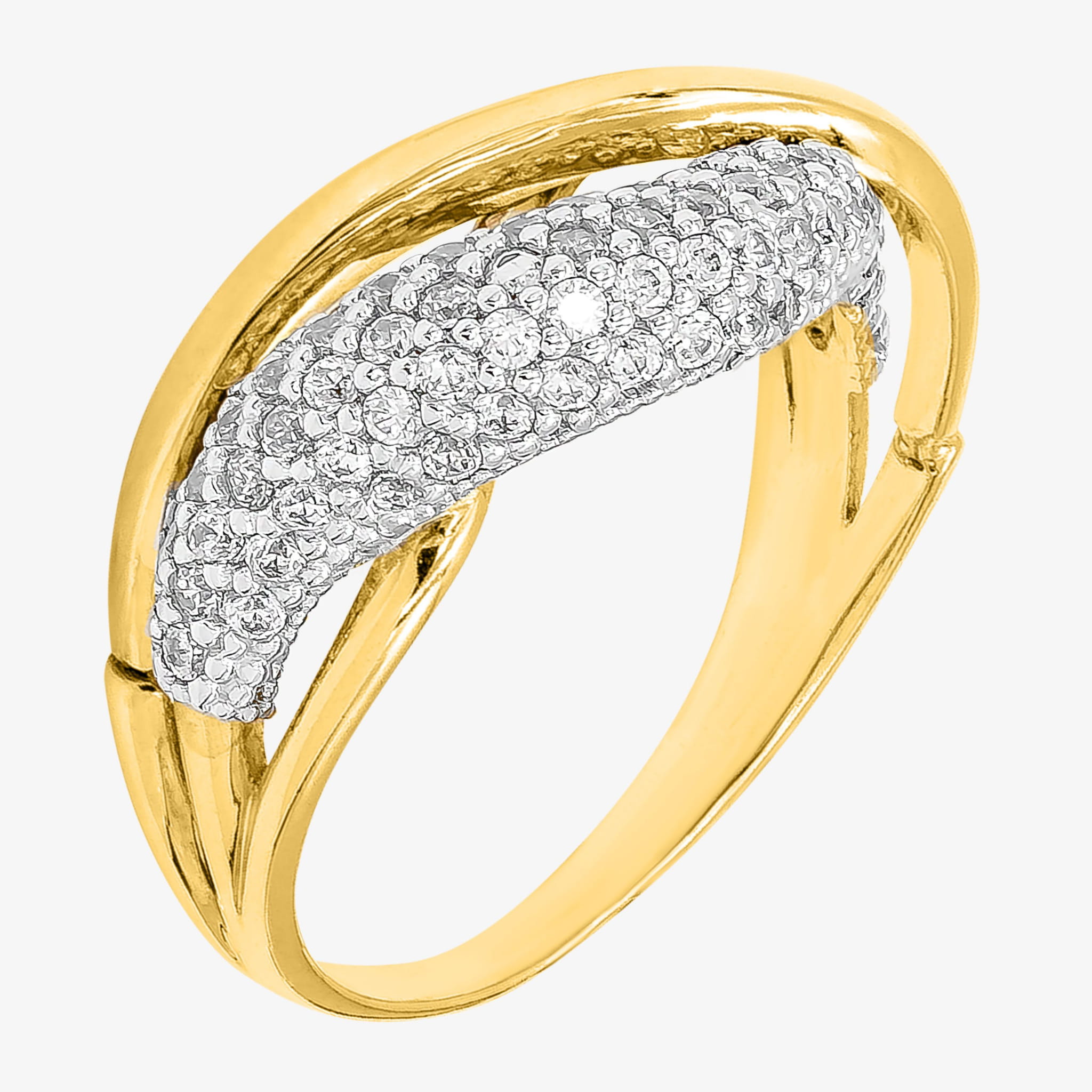 Złoty pierścionek o oryginalnym zaplatanym wzorze z wieloma osadzonymi białymi błyszczącymi cyrkoniami.