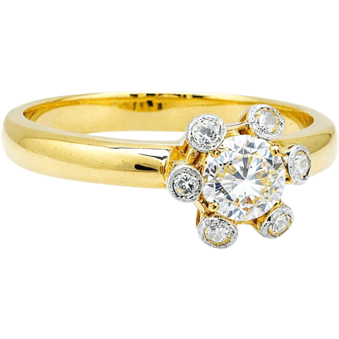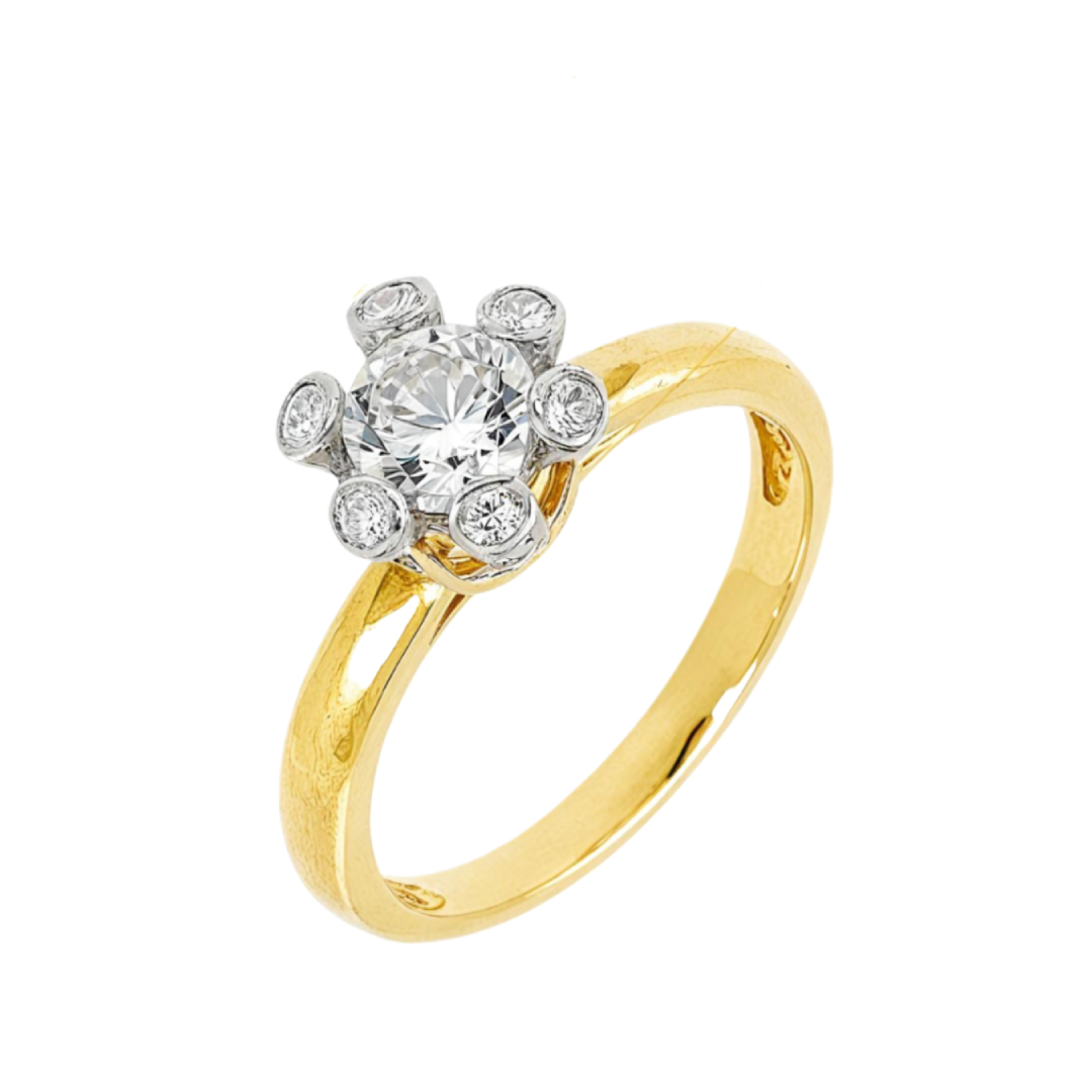 Złoty pierścionek o klasycznej, a jednocześnie dekoracyjnej formie, zaprojektowany z myślą o osobach ceniących elegancką biżuterię z wyraźnym detalem. Centralnie osadzony kamień główny został otoczony mniejszymi cyrkoniami, tworząc subtelną kompozycję inspirowaną kwiatowym układem. To pierścionek złoty, który łączy ponadczasową klasykę z delikatnym zdobieniem.