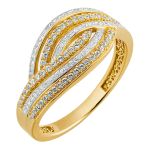 Złoty pierścionek o oryginalnym przeplatanym wzorze z osadzonymi białymi cyrkoniami.