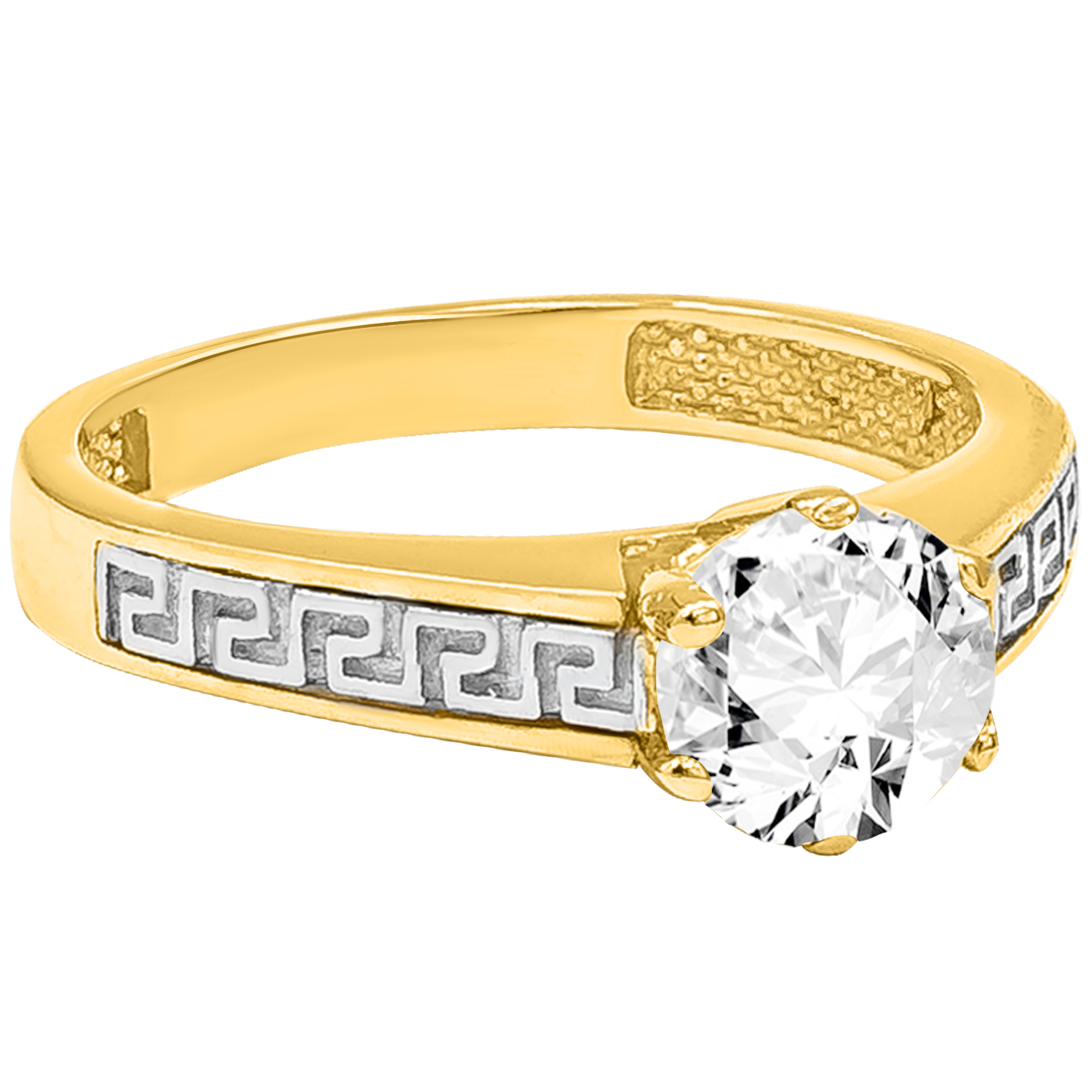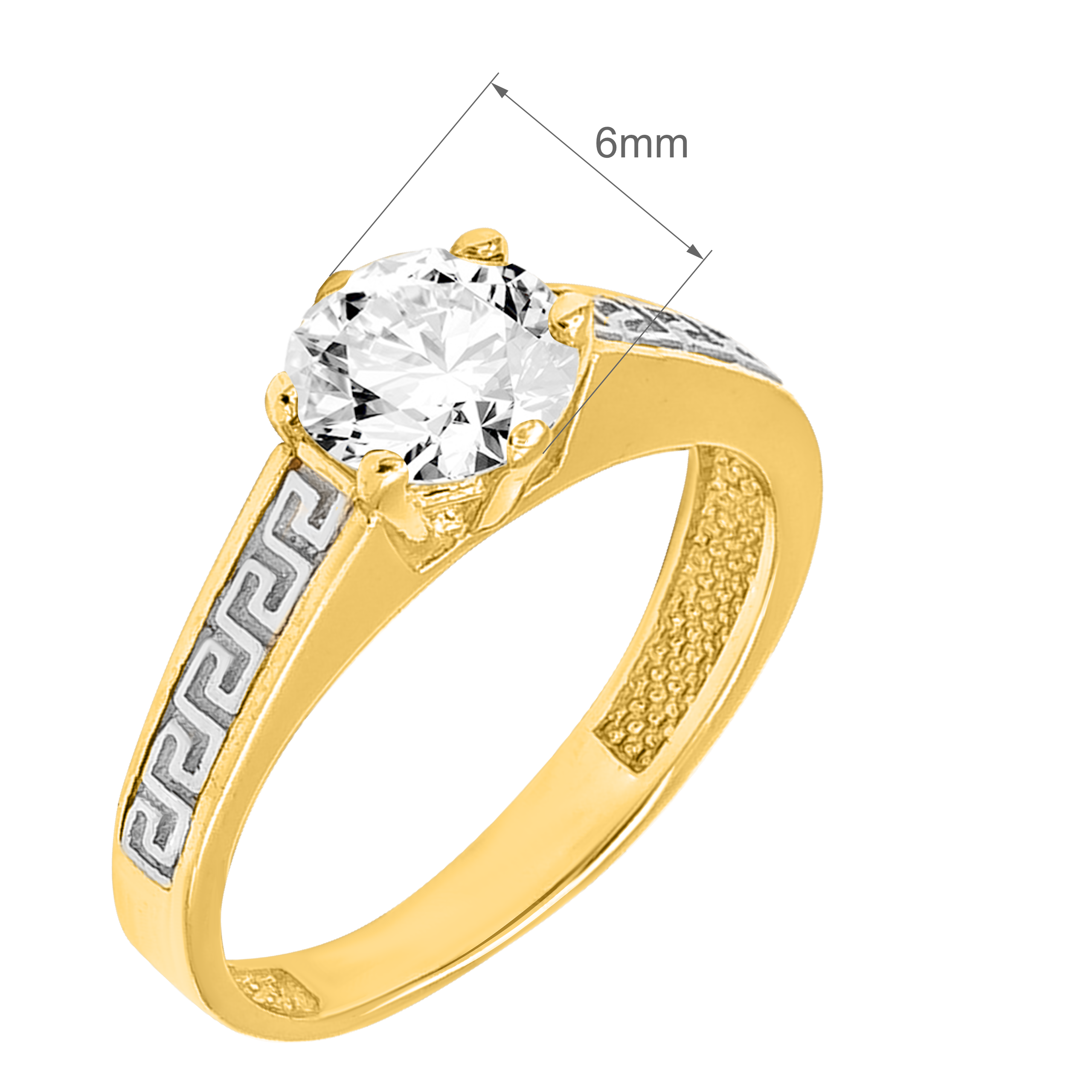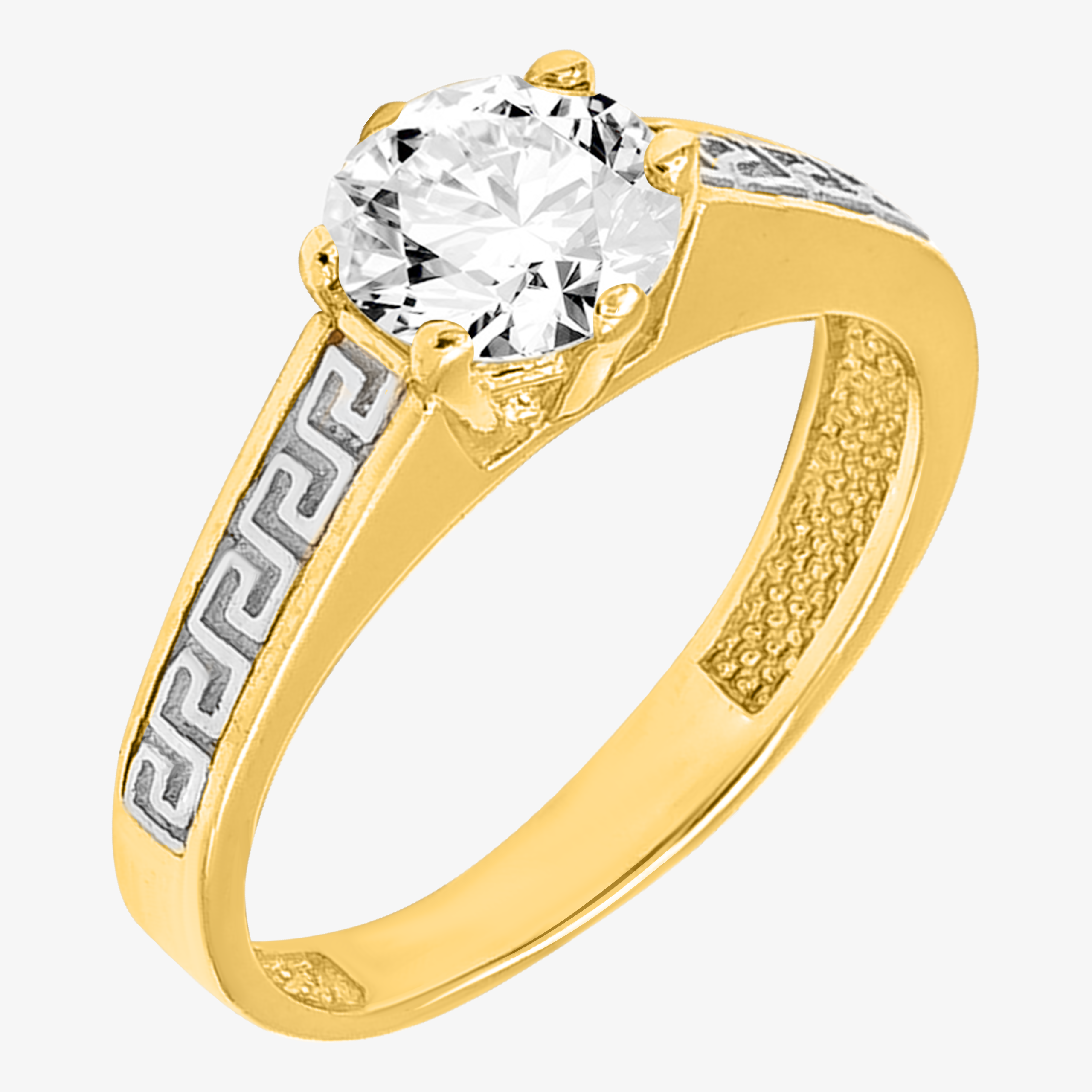 Złoty Pierścionek Zaręczynowy z Greckim Wzorem i Białą Błyszczącą Cyrkonią R10 0.585