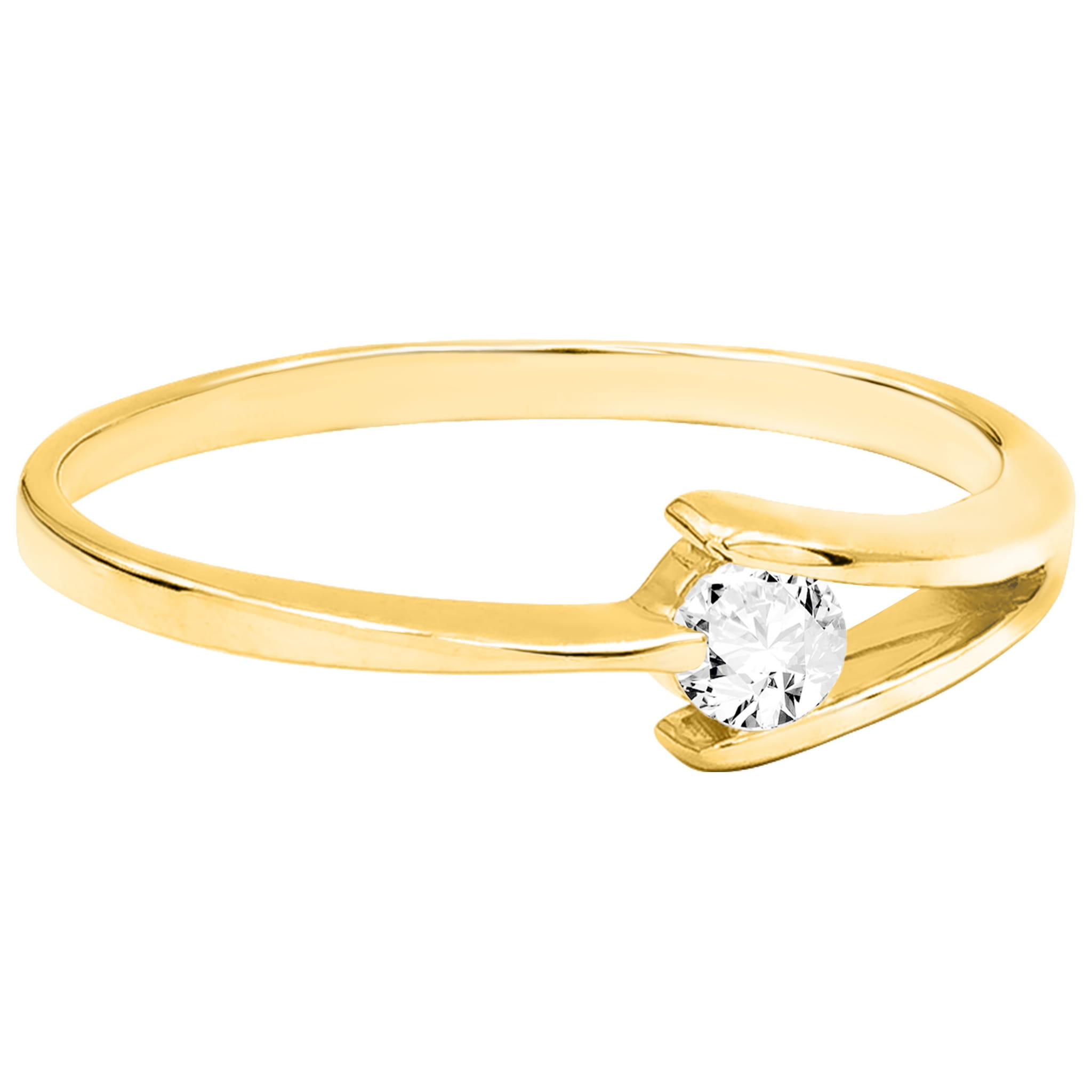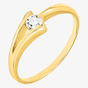 Złoty pierścionek z delikatnym wzorem i osadzoną białą cyrkonią.